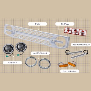 製品内容:グリル(ABS製未塗装)、エンブレム、ヘッドライト、ポジションウインカーランプ、コーナーマーカー、各種ステー