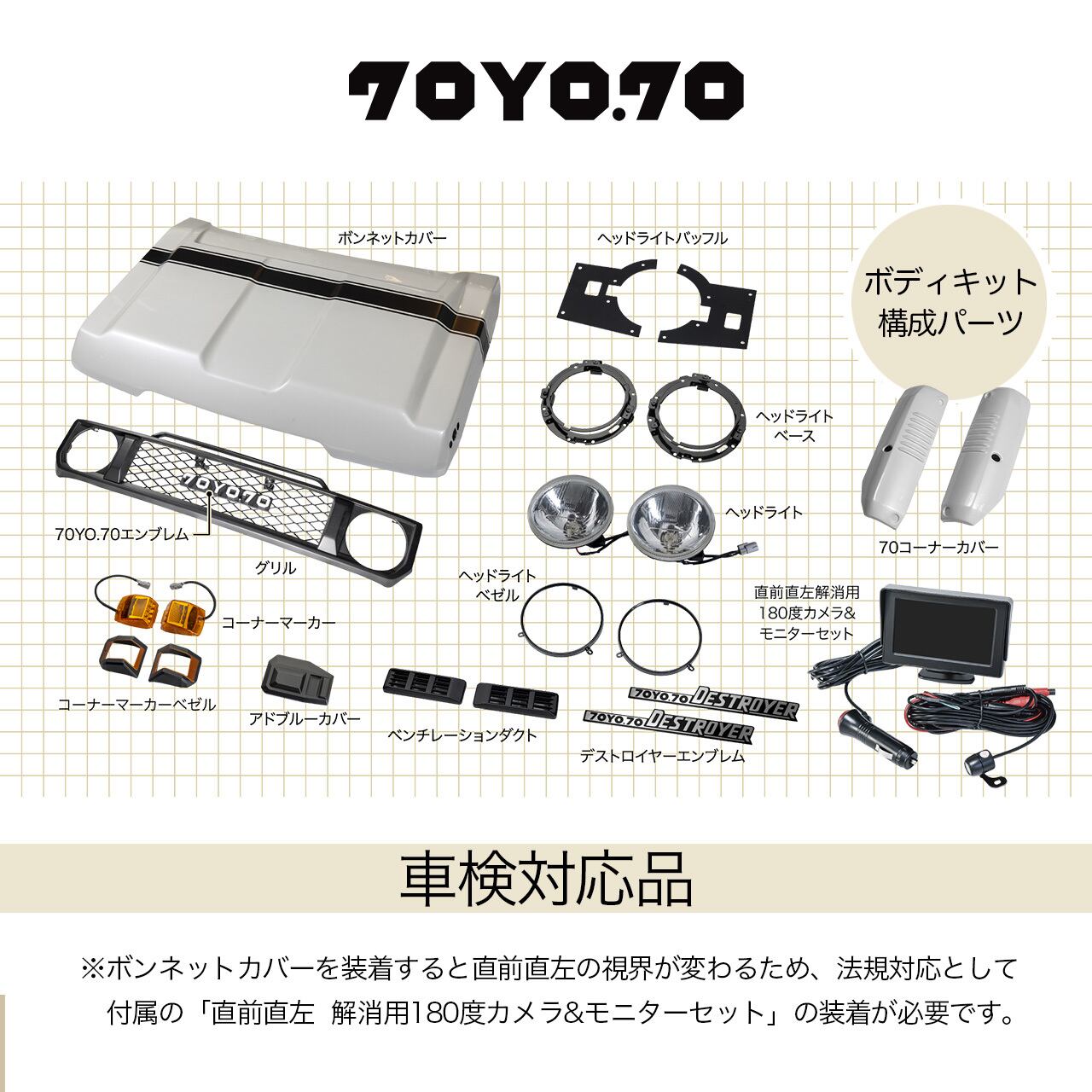 このセットには、ボンネットカバー、グリル、70YO.70エンブレム、ヘッドライトバッフル、ヘッドライトベース、ヘッドライト、ヘッドライトベゼル、コーナーマーカー、コーナーマーカーベゼル、アドブルーカバー、ベンチレーションダクト、デストロイヤーエンブレム、70コーナーカバー、直前直左解消用180度カメラ&モニター、各種ステーが付属します。