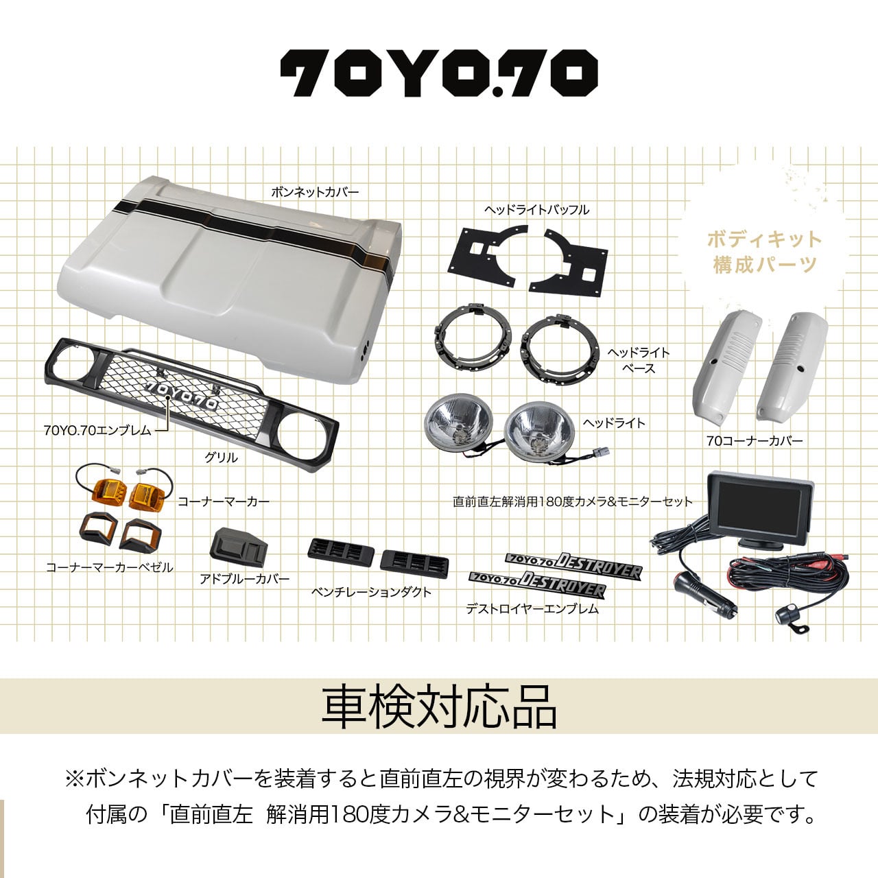 このセットには、ボンネットカバー、グリル、70YO.70エンブレム、ヘッドライトバッフル、ヘッドライトベース、ヘッドライト、コーナーマーカー、コーナーマーカーベゼル、アドブルーカバー、ベンチレーションダクト、デストロイヤーエンブレム、70コーナーカバー、直前直左解消用180度カメラ&モニター、各種ステーが付属します。