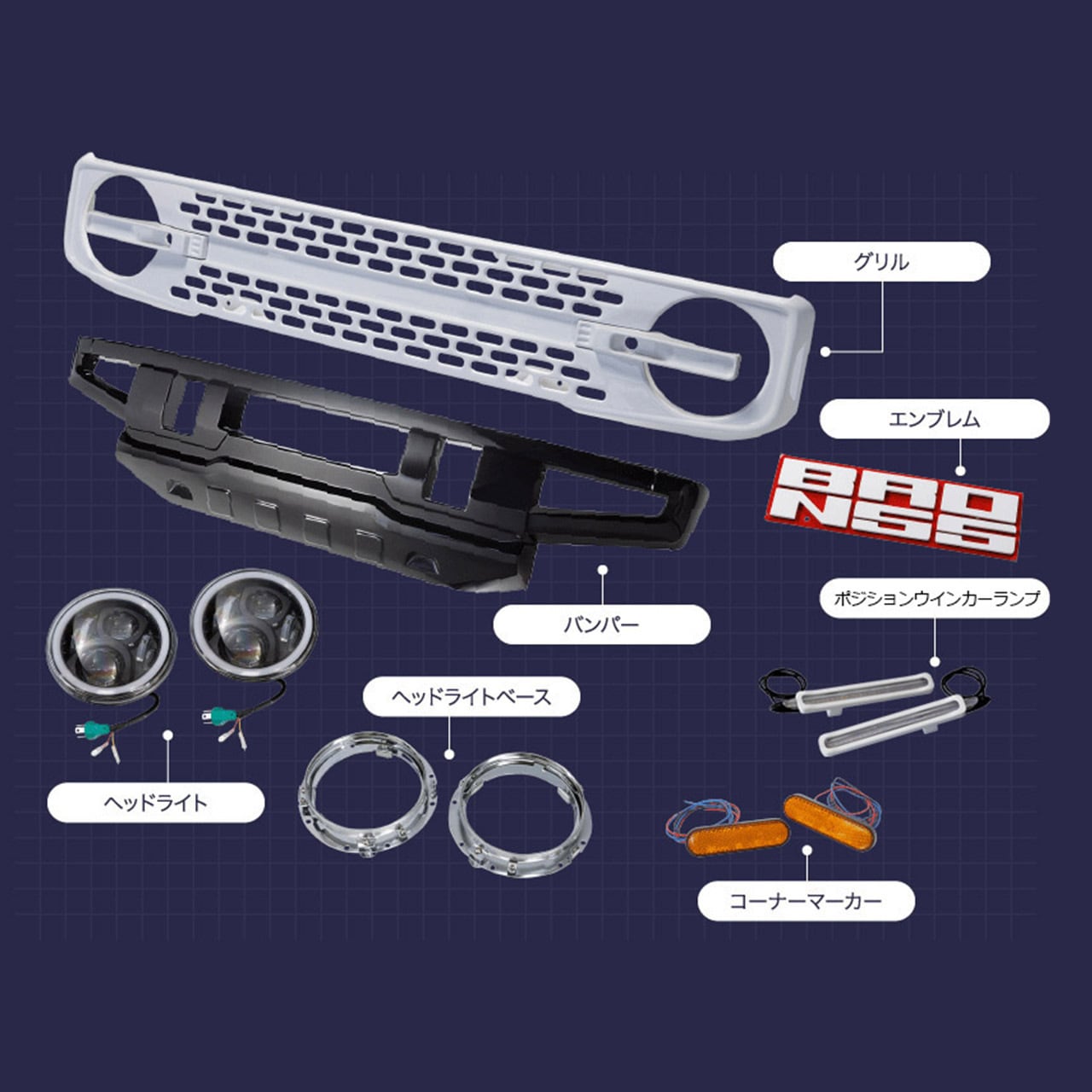 JB74Wジムニーシエラをレトロ風にできる、グリル&ヘッドライトセットとバンパーがキット化された製品です。